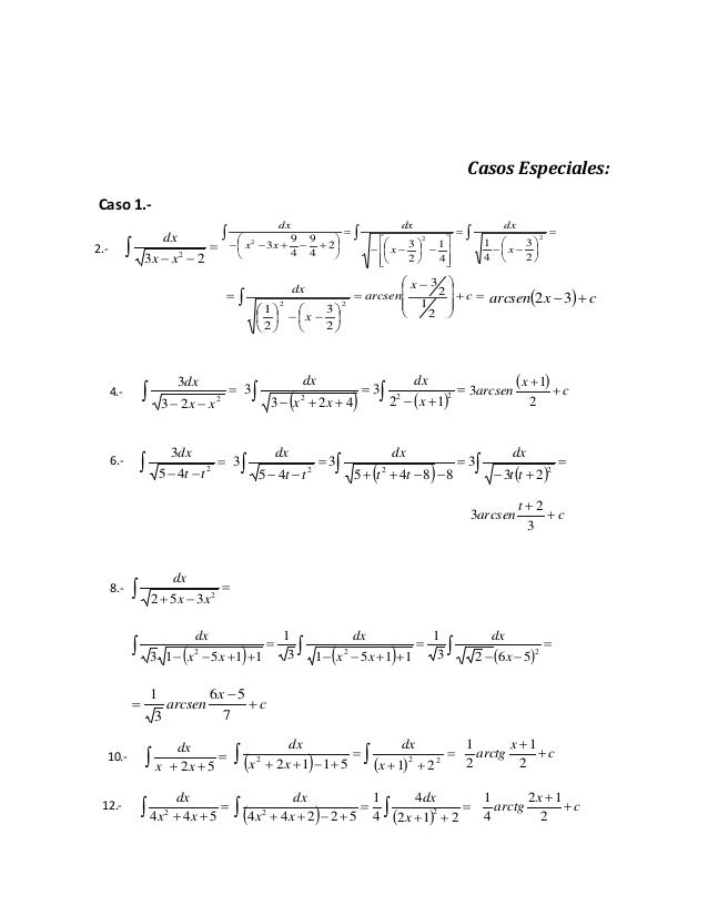 las cuales, para n > 1, se resuelven por un sencillo cambio de variable.b.3) Q(x) tiene raíces complejas distintas:Cuando en la factorización del polinomio Q(x) aparecen factores cuadráticos de la forma:ax2 + bx + c con b2 - 4ac < 0a cada uno de estos factores le corresponde una fracción parcial de la forma:donde A y B son constantes reales.